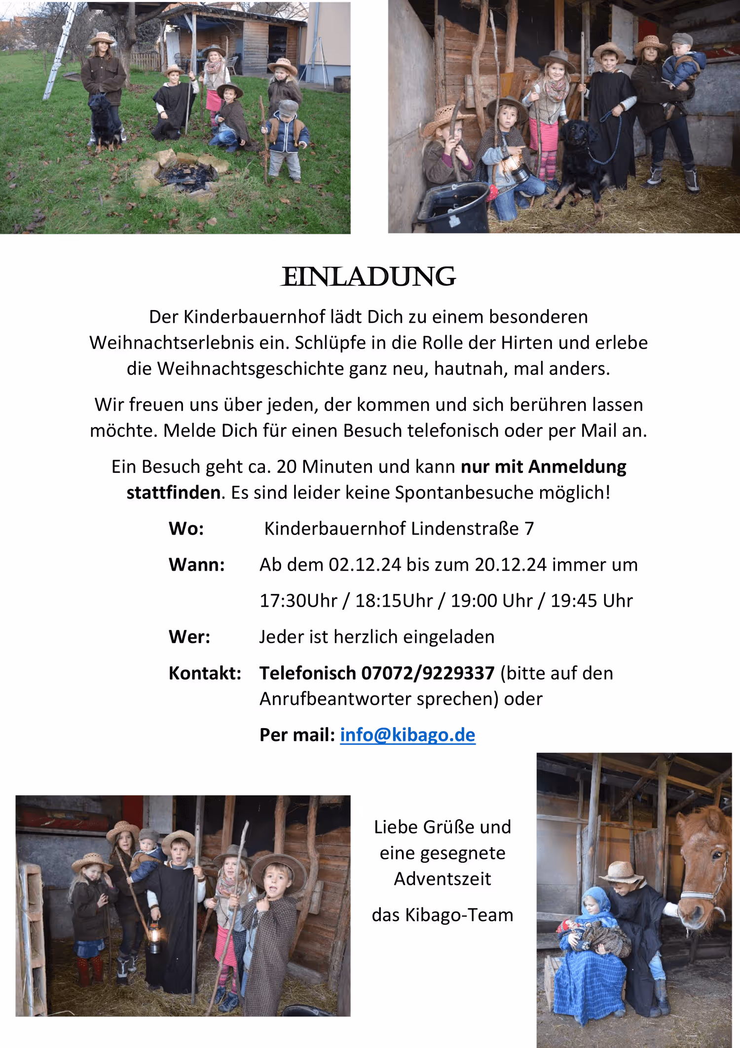 Wie die letzten Jahre möchten wir auch dieses Jahr wieder zu unserem besonderen Weihnachtserlebnis auf den Kinderbauernhof einladen.Schlüpfe in die Rolle der Hirten und erlebe die Weihnachtsgeschichte ganz neu, hautnah, mal anders.Wir freuen uns über jeden, der kommen und sich berühren lassen möchte.