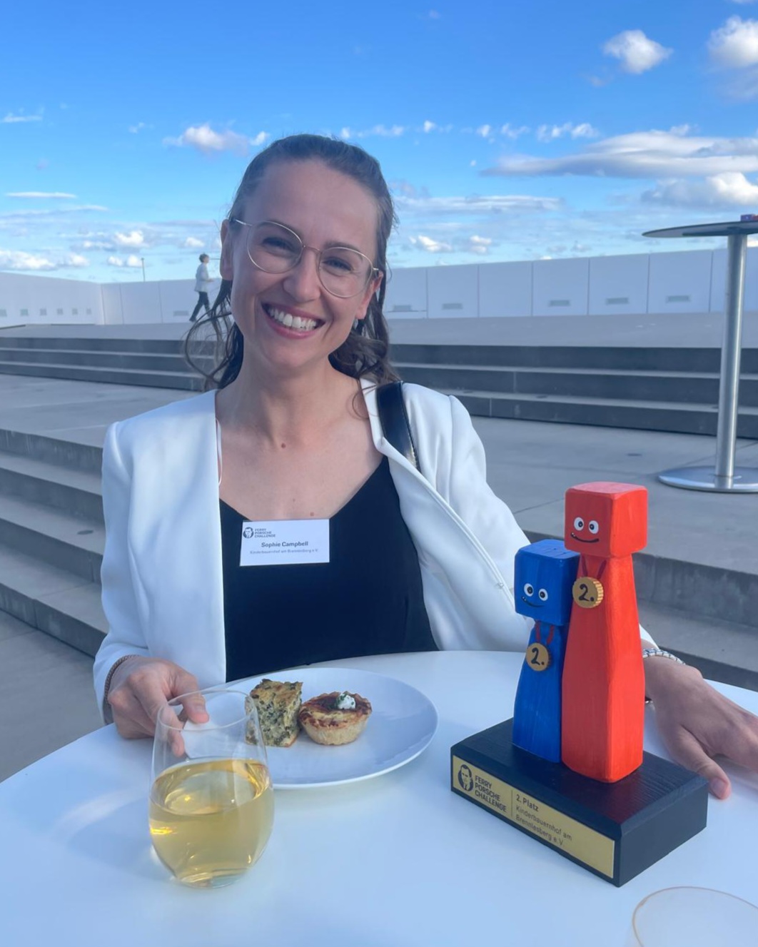 Die Spannung unter den ungefähr 50 anwesenden Gästen ist beinahe mit Händen zu greifen, als die Verantwortlichen auf der Bühne verkünden, welche Bewerber als einer der Drittplatzierten jeweils 25.000 Euro mit nach Hause nehmen dürfen. Unser Projekt ist nicht dabei – doch das bedeutet, dass der Kinderbauernhof einen der ersten oder zweiten Plätze belegen wird! Sophie und Marie, die für den Verein an der Preisverleihung teilnehmen, schließen schon einmal Wetten ab, welcher Platz am Ende herausspringen wird. Und dann wird unser Name genannt. Wir landen auf einem der zweiten Plätze und erhalten dadurch Fördergelder in Höhe von sage und schreibe 50.000 Euro für unser Projekt der pferdegestützten Pädagogik, mit dem wir uns bei der Ferry Porsche Challenge 2025 beworben haben. Die Freude ist riesengroß und insgeheim sind Marie und Sophie zumindest für den Moment auch ein bisschen froh, dass wir nicht unter den drei Erstplatzierten gelandet sind – das hätte nämlich bedeutet, dass die beiden auf die Bühne kommen und ein paar Fragen beantworten hätten müssen.